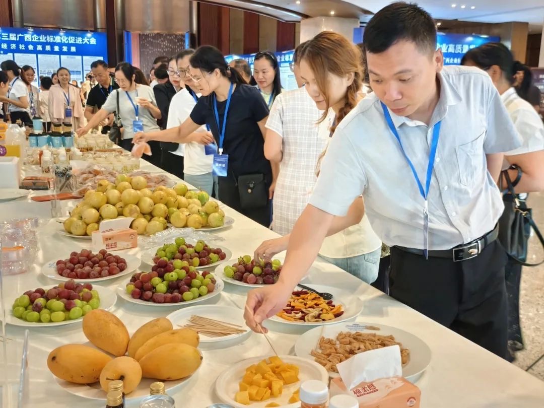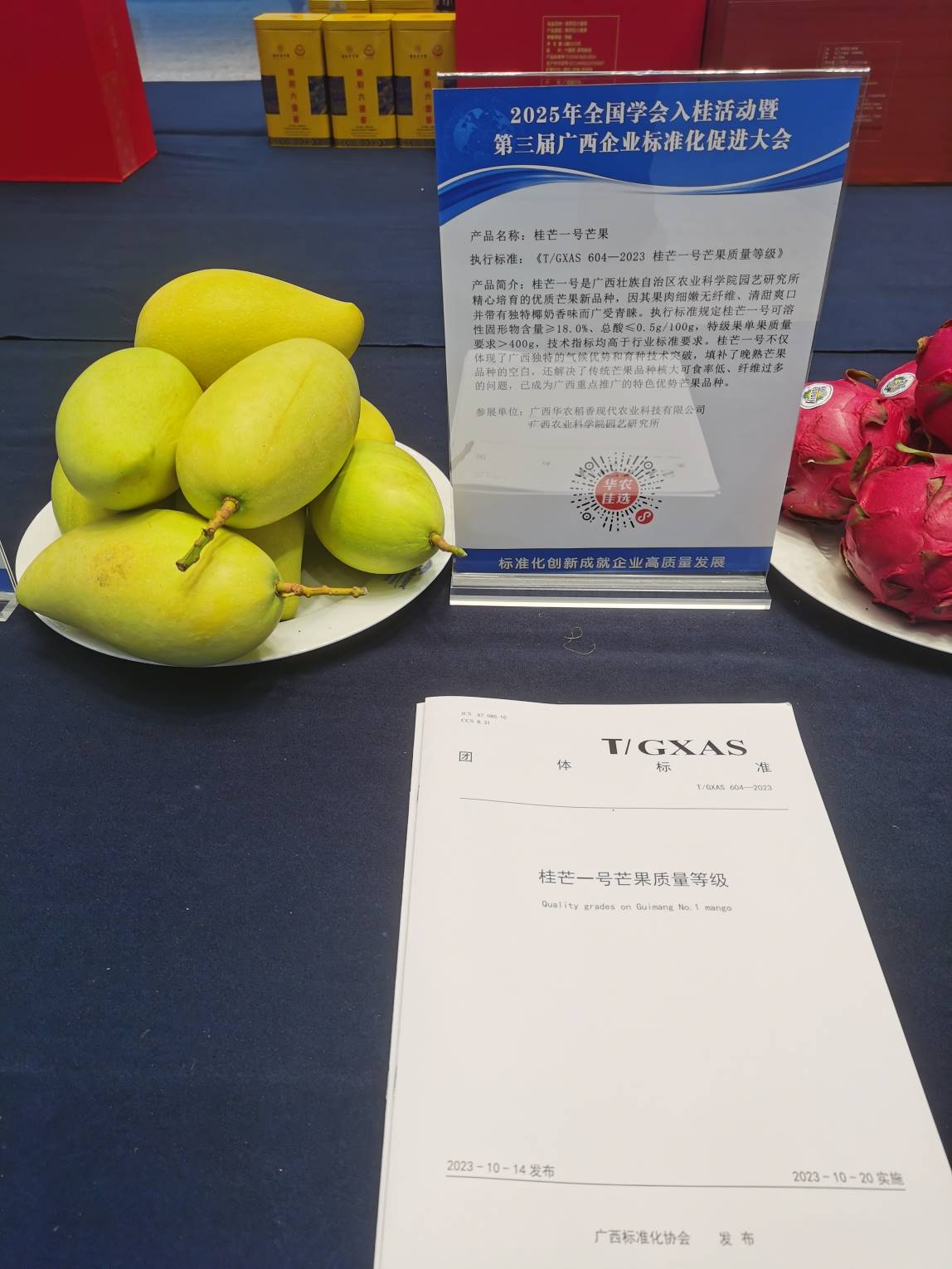 大会特别设置了先进性企业标准、原创性高质量团体标准成果展区。其中,国家香蕉(芒果)产业技术体系芒果百色综合试验站与广西华农创科现代农业科技集团有限公司旗下华农芒香的椰奶芒公司联合制定的《桂芒一号芒果质量等级》和《桂芒一号芒果栽培技术规程》团体标准作为原创性高质量团体标准成果在展会中精彩亮相。'桂芒一号'展台前人头攒动,众多参会者驻足品尝,其独特的风味和卓越的品质赢得了与会嘉宾的一致赞誉。