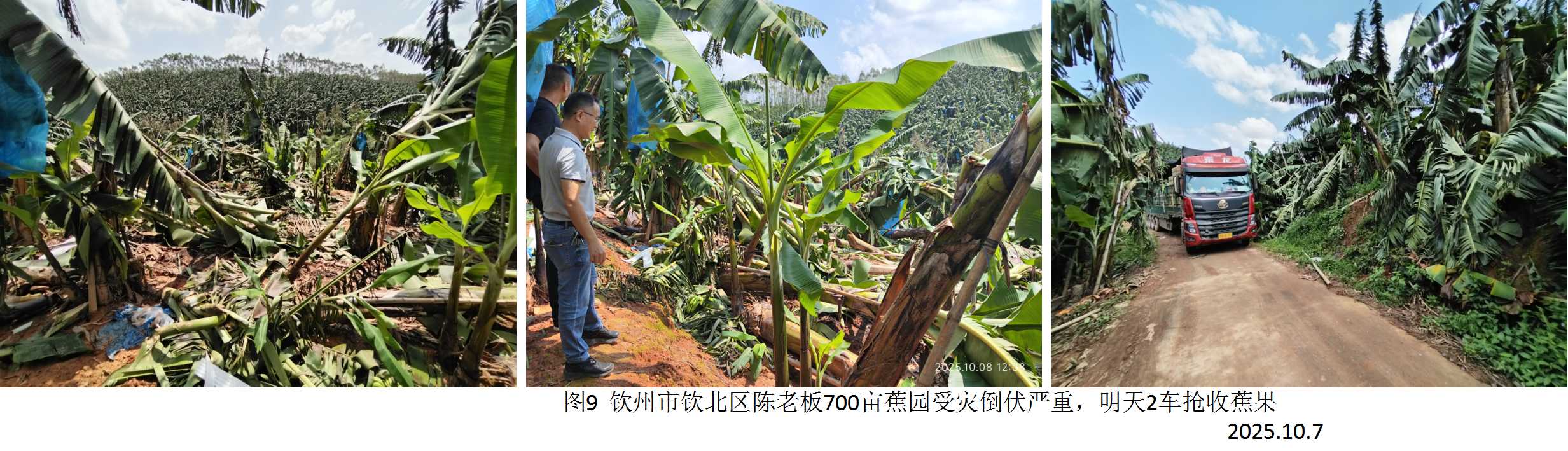 随着调研范围扩大,南宁站于10月7日至8日先后赴江南区、扶绥县(图4-图8),以及钦北防(钦州、北海、防城港)等沿海重灾区。调研发现,江南区、崇左市扶绥县等地,大部分植株除芽挂果期,成熟度5-7成,风力大概8级,有收蕉大棚被刮倒,植株倒伏比例0.5-5%,个别植株翻根,全部叶子中度撕裂。从抢收现场了解,卖价0.8-1.0元/斤。
