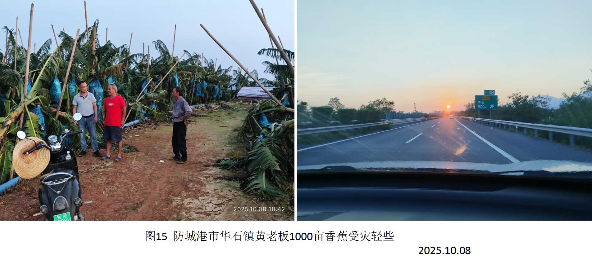 钦北区陈老板描述蕉园台风风级达8-10级,山地第三造700亩常规苗打桩加绳固定,但预估倒伏仍5%-8%,已经连续3天采收倒蕉(每天2车),0.8元/斤(图9)。中午,北海市合浦县廉州镇青山村庞支书介绍,台风达12级,全村1000多亩香蕉全部倒伏,其本人300多亩蕉园也无法幸免(图10—图12),新植小苗受损较小,但因抽蕾的打桩粉蕉倒伏率30%,其他叶子严重撕裂成丝条状,支书还说以青山村为中心30公里半径电力受破坏严重,全国各地有500多人电工来本地抢修4天了,电力还没有恢复,这也是导致我们进村导航信号微弱的重要原因。值得丝丝安慰的是:庞支书带领全村蕉农买了保险,正在理赔(每亩赔1600元)阶段。合浦县利添3000亩蕉园(图13、图14),由于打桩,经受11-12级台风影响,倒蕉估计30%左右,但叶子撕裂折断,香蕉果即使还挂在树上,但损伤也非常严重,连续5天已经定好抢收蕉果,每天采收8-12车。防城港市华石镇黄老板1000亩一代常规品种打桩山地蕉园(图15),风力小(6-8级),地势高处有折断倒伏,叶子撕裂也较轻,估计损失2000多株。