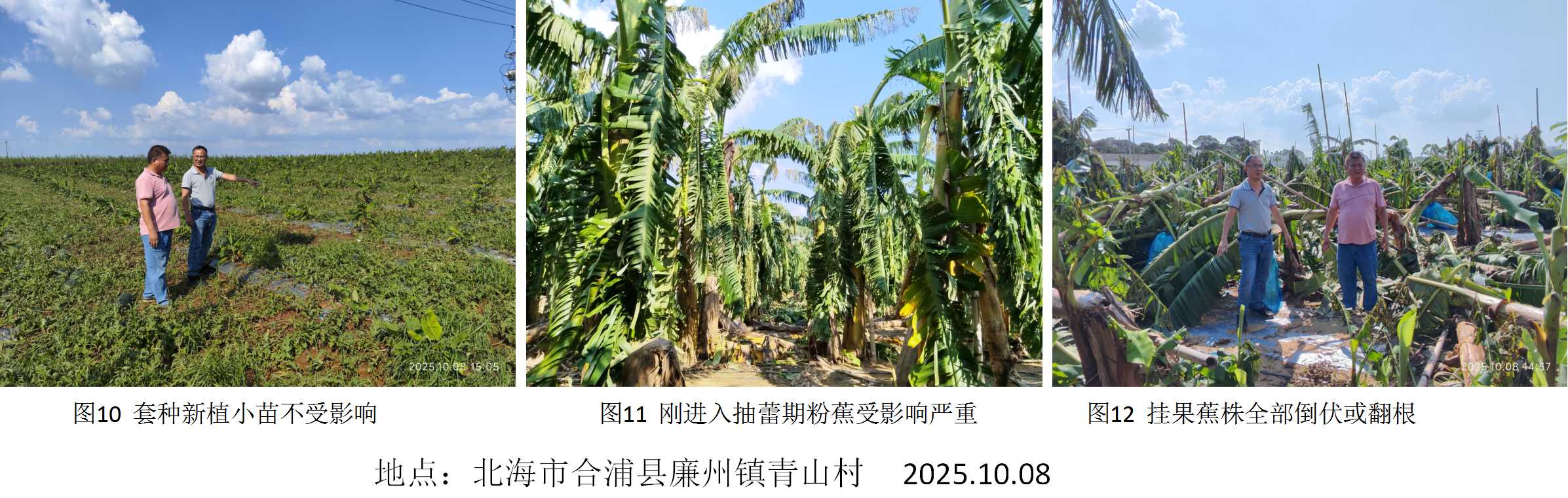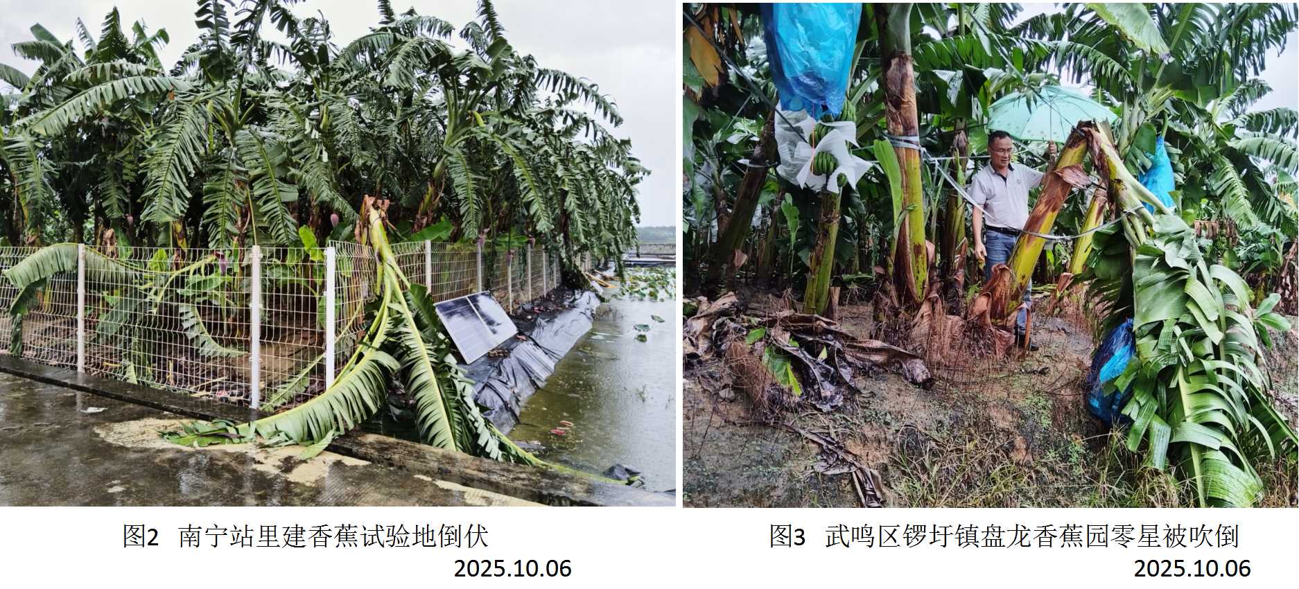 2025年国庆、中秋双节期间,国家香蕉(芒果)产业技术体系南宁综合试验站(以下简称“南宁站”)密切关注“博罗依”“麦德姆”等台风的动态发展,及时响应体系应急服务号召,自10月6日起连续多日深入广西多个香蕉主产区,实地调查台风造成的灾害影响,为灾后恢复提供第一手信息。