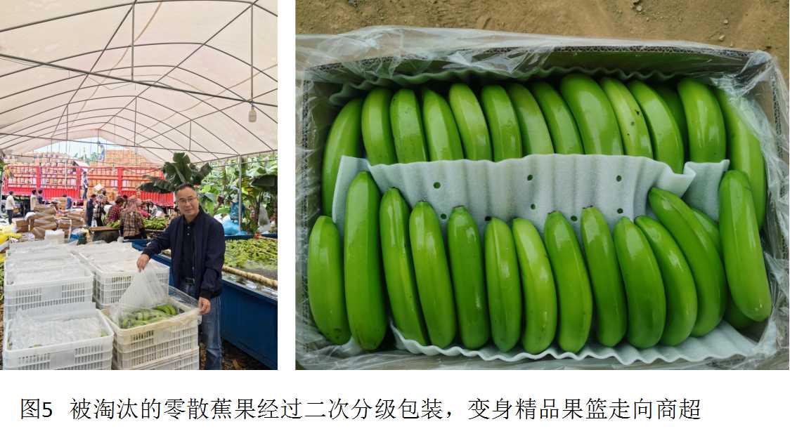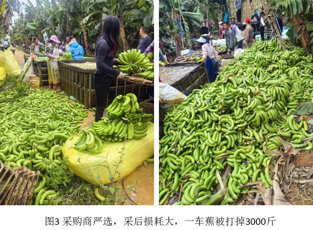 买方市场特征明显: 由于供应充裕,采购商拥有较强议价权,对果品外观质量(如梳形、果指长度、机械损伤、病虫害斑等)要求异常严格,导致采后分级过程中的损耗率增加。在隆安县一基地观察到,一车蕉因外观稍有瑕疵被剔除的次级果高达约1500公斤,造成了直接经济损失巨大。
