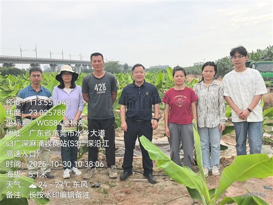 2025年10月29日,国家香蕉(芒果)产业技术体系生物防治与综合防控岗位李云锋教授等4人赴广东东莞香蕉标准化绿色生产示范点伟冠香蕉园、红利香蕉合作社等开展香蕉病害常规调查与香蕉枯萎病生物防治大田试验。东莞市农业科学研究中心吕顺研究员、曾莉莎研究员一起参加了此次调研活动。