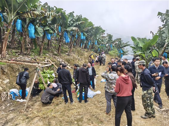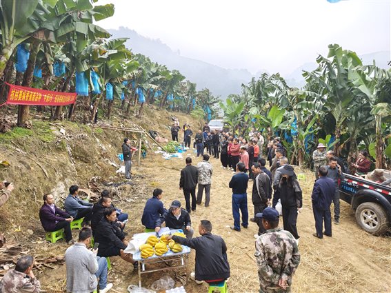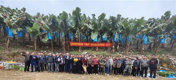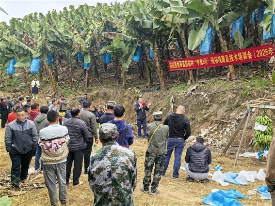 2025年12月5日,国家香蕉(芒果)产业技术体系种质资源收集与评价岗位与红河综合试验站在云南省红河州河口县老范寨乡联合召开“抗枯萎病香蕉新品种‘中蕉8号’现场观摩及技术培训会”。会议邀请河口县农科局植检植保站站长周跃能、农广校校长凌辉高级农艺师等当地农技部门领导到场指导。来自国家香蕉育种攻关组成员单位、体系岗站团队以及红河州、文山州、西双版纳州和普洱市等产区的育苗户、种植户共计150余人参会,现场气氛热烈。