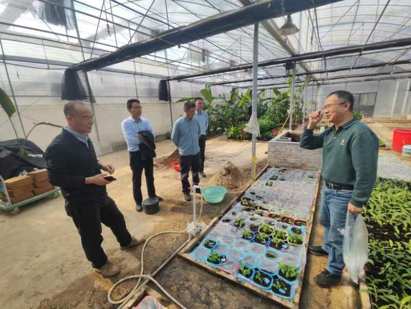 在南宁站站长邹瑜研究员的陪同下,李国田教授深入试验站科研一线。他首先品尝了团队精心培育的香蕉杂交F1代果实,对其在保持优良基础风味的同时所呈现出的独特品质赞誉有加,认为这批材料为培育兼具特色风味与市场潜力的新品种奠定了扎实基础。随后,李教授移步杂交后代育苗大棚,实地察看不同杂交组合后代种苗的培育过程和生长情况,详细了解南宁站利用杂交育种技术在三倍体香蕉抗病遗传改良方面取得的阶段性进展。他对团队敢于创新、坚持通过杂交途径突破三倍体香蕉遗传瓶颈的努力给予了充分肯定。