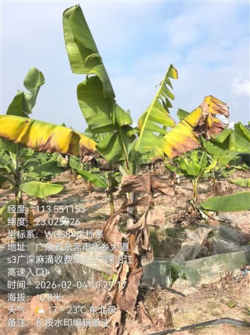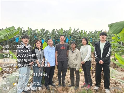 2026年2月4日,国家香蕉(芒果)产业技术体系生物防治与综合防控岗位李云锋教授等5人赴广东东莞市麻涌镇开展香蕉标准化绿色生产示范点伟冠香蕉园开展香蕉病害常规调查与香蕉枯萎病生物防治大田试验。东莞市农业科学研究中心吕顺研究员、曾莉莎研究员一起参加了此次调研活动。