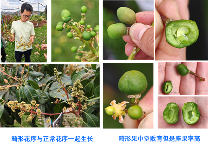 根据潘宏兵副研究员的介绍,畸形花受内源激素紊乱影响,普遍发育粗壮,较正常花表现为花序紧凑、花朵较大、颜色偏绿;畸形花幼果胚发育不良,在花序营养耗尽后幼果自然脱落,几乎不能正常坐果。
