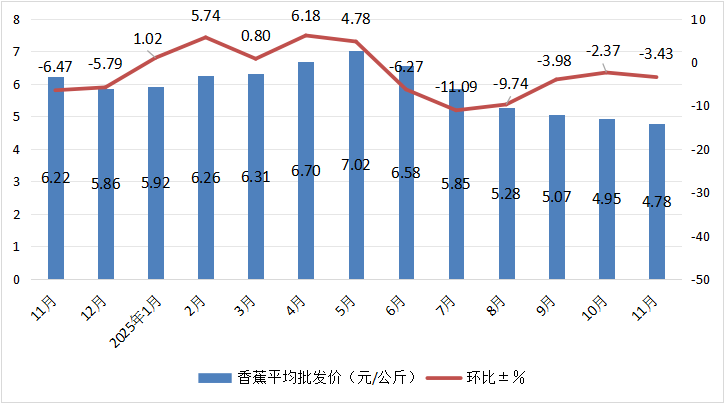 由全国香蕉平均批发价月度走势图可以看到,2024年11月—2025年11月,全国香蕉平均批发价格从6.22元/公斤波动至4.78元/公斤;近一年峰值为2025年5月的7.02元/公斤,谷值为2025年11月的4.78元/公斤。(具体如图4所示)