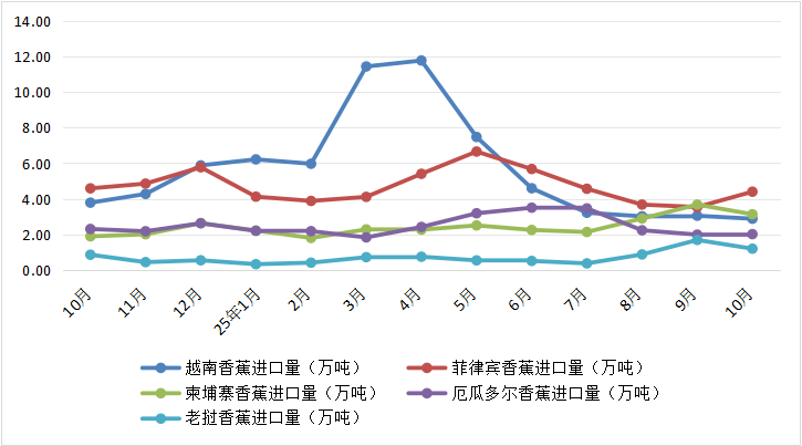 2024年10月—2025年10月,我国对越南香蕉进口量从3.78万吨变动为2.88 万吨,每月对应的环比上涨/下降幅度从46.05%变化至-5.55%;近一年峰值为2025年4月的11.77万吨,谷值为2025年10月的2.88万吨。对菲律宾香蕉进口量从4.59万吨变动为4.40万吨,每月对应的环比上涨/下降幅度从64.03%变化至24.39%;近一年峰值为2025年5月的6.66万吨,谷值为2025年9月的3.54万吨。对柬埔寨香蕉进口量从1.89万吨变动为3.13万吨,每月对应的环比上涨/下降幅度从-8.05%变化至-14.77%;近一年峰值为2025年9月的3.68万吨,谷值为2025年2月的1.80万吨。对厄瓜多尔香蕉进口量从2.30万吨变动为2.01万吨,每月对应的环比上涨/下降幅度从3.89%变化至1.36%;近一年峰值为2025年6月的3.50万吨,谷值为2025年3月的1.83万吨。对老挝香蕉进口量从0.86 万吨变动为1.20万吨,每月对应的环比上涨/下降幅度从14.69%变化至-29.16%;近一年峰值为2025年9月的1.69万吨,谷值为2025年1月的0.33万吨。