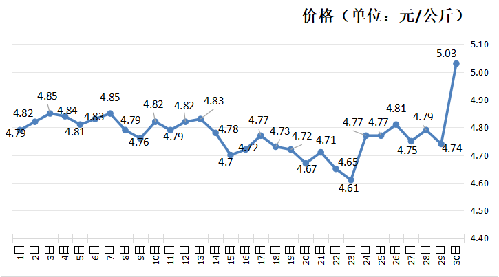 根据农业农村部市场与信息化司提供的数据,可以看到2025年11月全国香蕉日平均批发价从4.79元/公斤波动至5.03元/公斤,近一个月峰值为2025年11月30日的5.03元/公斤,谷值为2025年11月23日的4.61元/公斤,11月全国香蕉平均批发价格整体较上月有所下跌。(具体如图3所示)