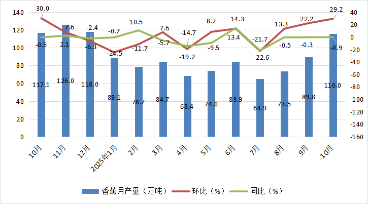 从我国香蕉主产区总产量月度走势图可以看出,2025年10月,较上月产量增加了26.2万吨,较上年同期产量减少了1.1万吨。从历史数据来看,2024年10月~2025年10月,全国香蕉主产区总产量从117.1万吨波动至116.0万吨;每月对应的环比增加/减少幅度从30.0%变化至29.2%;近一年峰值为2024年11月的126.0万吨,谷值为2025年7月的64.9万吨。(具体如图1所示)