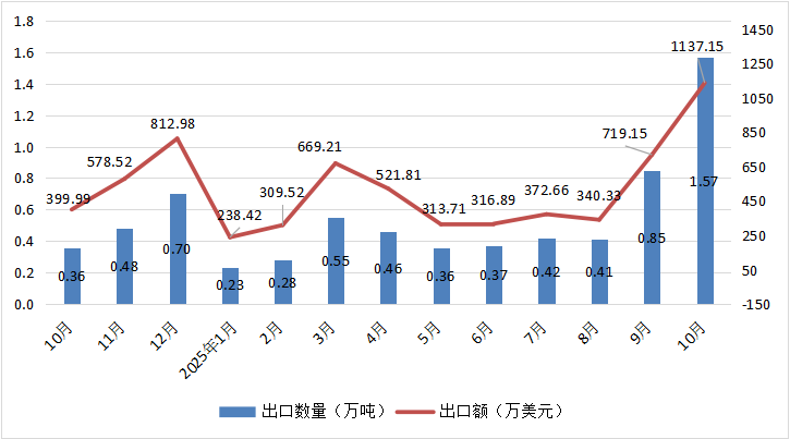 根据中国海关总署提供的数据,2025年10月我国香蕉出口量为1.57万吨,出口额为1137.15万美元,与上年同期相比,出口量增加了339.29%,出口额增加了184.29%,与上月相比,出口量增加了83.68%,出口额上涨了58.12%。从历史数据来看,2024年10月—2025年10月,全国香蕉出口量从0.36万吨波动至1.57万吨,近一年峰值为2025年10月的1.57万吨,谷值为2025年1月的0.23万吨;出口额从399.99万美元波动至1137.15万美元,近一年峰值为2025年10月的1137.15万美元,谷值为2025年1月的238.42万美元。2025年1月~2025年10月,我国香蕉累计出口5.50万吨,同比上年同期上涨18.28%;累计出口额为4938.85万美元,同比上年同期减少7.27%。(具体如图7所示)