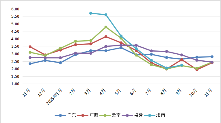根据中国果品流通协会提供的香蕉(一级以上)收购价格数据,2024年11月~2025年11月,广东省香蕉收购价格从2.33元/公斤波动至2.80元/公斤,每月对应的环比上涨/下降幅度从-15.81 %变化至1.08 %;近一年峰值为2025年5月的3.40元/公斤,谷值为2024年11月的2.33元/公斤。广西区香蕉收购价格从3.46元/公斤波动至2.40元/公斤,每月对应的环比上涨/下降幅度从-25.52 %变化至23.71 %;近一年峰值为2025年4月的4.14元/公斤,谷值为2025年10月的1.94元/公斤。云南省香蕉收购价格从3.10元/公斤波动至2.44元/公斤,每月对应的环比上涨/下降幅度从-24.89 %变化至20.20 %;近一年峰值为2025年4月的4.78元/公斤,谷值为2025年8月的1.99元/公斤。福建省香蕉收购价格从2.74元/公斤波动至2.44元/公斤,每月对应的环比上涨/下降幅度从16.10 %变化至-5.06 %;近一年峰值为2025年5月的3.57元/公斤,谷值为2025年11月的2.44元/公斤。海南省香蕉上市集中在3~9月,收购价格从5.70元/公斤波动至2.24元/公斤;近一年峰值为2025年3月的5.70元/公斤(国家香蕉产业技术体系监测数据),谷值为2025年8月的2.05元/公斤。(具体如表4所示)