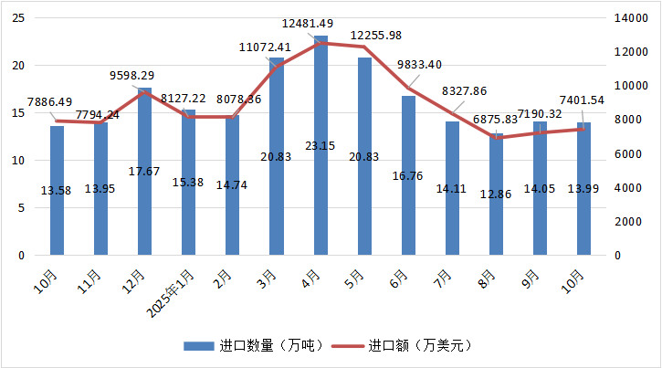 根据中国海关总署提供的数据,2025年10月我国香蕉进口量为13.99万吨,进口额为7401.54万美元,与上年同期相比,进口量上涨了3.01%,进口额减少了6.15%,与上月相比,进口量减少了0.43%,进口额增加了2.94%。从历史数据来看,2024年10月—2025年10月,全国香蕉进口量从13.58万吨波动至13.99万吨,近一年峰值为2025年4月的23.15万吨,谷值为2025年8月的12.86万吨;进口额从7886.49万美元波动至7401.54万美元,近一年峰值为2025年4月的12481.49万美元,谷值为2025年8月的6875.83万美元。2025年1月~2025年10月,我国香蕉累计进口166.70万吨,同比上年同期增加21.60%;累计进口额为91644.41万美元,同比上年同期增加24.91%。(具体如图6所示)