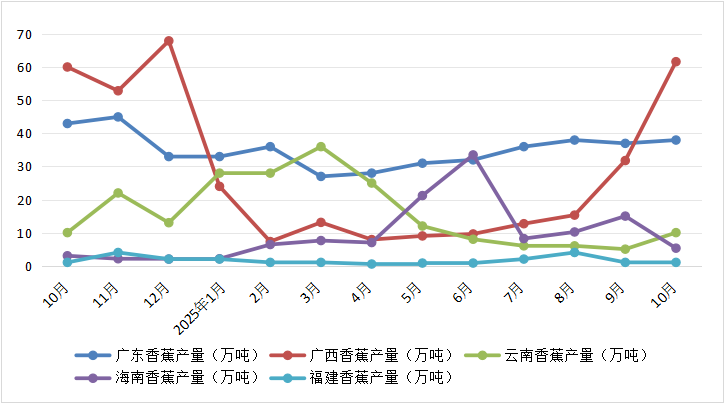 月份 | 广东香蕉产量(万吨) | 广西香蕉产量(万吨) | 云南香蕉产量(万吨) | 海南香蕉产量(万吨) | 福建香蕉产量(万吨) |