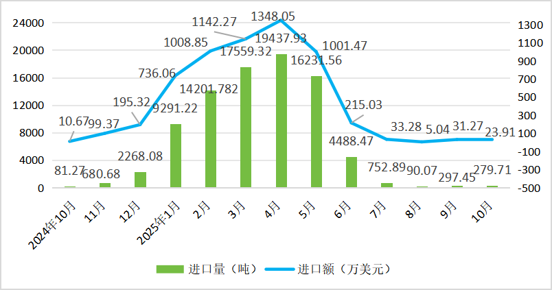 根据中国海关总署数据,2025年10月我国芒果进口量为279.71吨,进口额为23.91万美元,与2024年同期相比,进口量增加了2.44倍,进口额增加了1.24倍。与上月相比,进口量减少了5.96%,进口额下降了23.54%。从历史数据来看,2024年10月~2025年10月,全国芒果进口量从81.27吨波动至279.71吨,近一年峰值为2025年4月的19437.93吨,谷值为2024年10月的81.27吨;进口额从10.67万美元波动至23.91万美元,近一年峰值为2025年4月的1348.05万美元,谷值为2025年8月的5.04万美元。2025年1月~2025年10月,我国芒果累计进口82630.40吨,累计金额为5545.23万美元。(具体如图4所示)