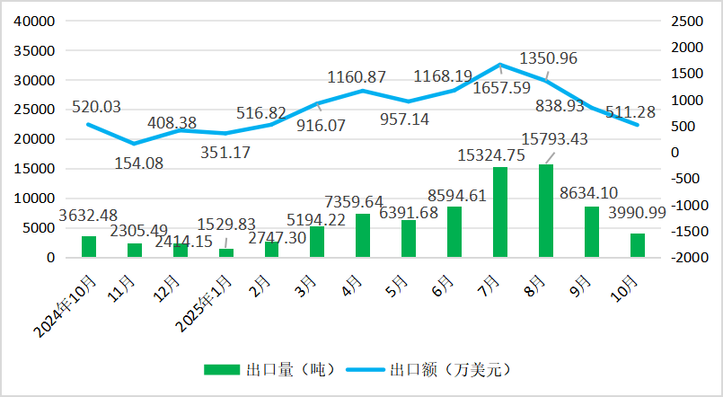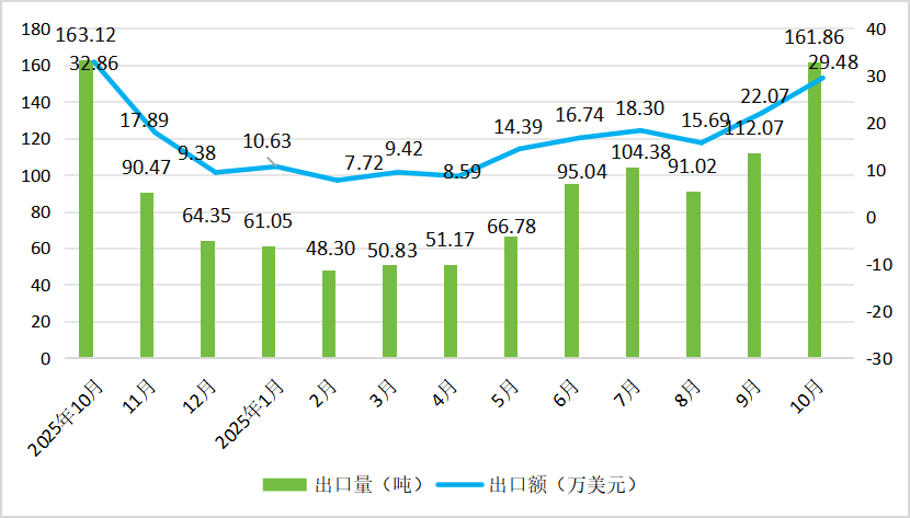 2025年10月我国芒果汁出口量为161.86吨,出口额为29.48万美元,与2024年同期相比,出口量下降了0.7%,出口额减少了10.29%;与上月相比,出口量增加了44.43%,出口额增加了33.57%。从历史数据来看,2024年10月~2025年10月,全国芒果汁出口量从163.12吨波动至161.86吨,近一年峰值为2024年10月的163.12吨,谷值为2025年2月的48.30吨;出口额从32.86万美元波动至29.48万美元,近一年峰值为2024年10月的32.86万美元,谷值为2025年2月的7.72万美元。2025年1月~2025年10月,我国芒果汁累计出口842.5吨,累计出口总额为153.03万美元。(具体如图7所示)