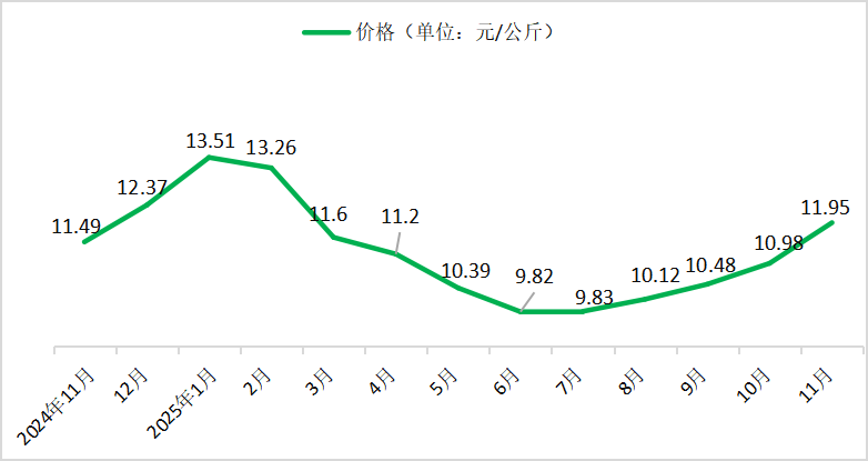由全国芒果平均批发价月度走势图可以看到,2024年11月~2025年11月,全国芒果平均批发价格从11.49元/公斤波动至11.95元/公斤;与上年同期相比,芒果批发价格上涨4.0%;近一年峰值为2025年1月的13.51元/公斤,谷值为2025年6月的9.82元/公斤。(具体如图2所示)
