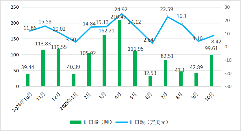 根据中国海关总署数据,2025年10月我国芒果汁进口量为99.61吨,进口额为8.42万美元,与2024年同期相比,进口量增加了近1.5倍、进口额减少29.00%。从历史数据来看,2024年10月~2025年10月,全国芒果汁进口量从39.44吨波动至99.61吨,近一年峰值为2025年4月的210.45吨,谷值为2025年6月的32.53吨;进口额从11.86万美元波动至8.42万美元,近一年峰值为2025年4月的24.92万美元,谷值为2025年6月的2.64万美元。2025年1月~2025年10月,我国芒果汁累计进口总量为935.56吨,累计金额为126.36万美元。(具体如图6所示)