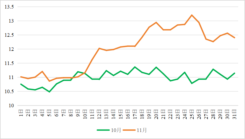 图1 2025年10月和11月全国芒果平均批发价每日走势