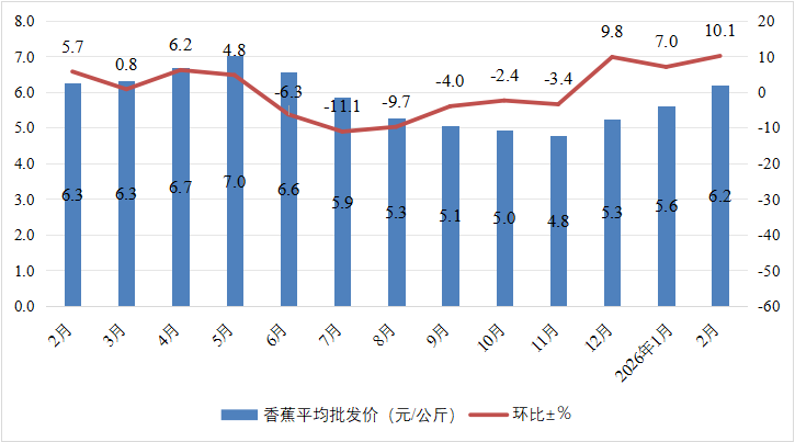 根据农业农村部市场与信息化司、农业农村部信息中心提供的数据,2026年2月,全国香蕉平均批发价为6.2元/公斤,与上月相比上涨了10.1%,与上年同期相比下跌了1.1%;平均零售价格为8.8元/公斤,与上月相比上涨了5.6%,与上年同期相比下跌了0.5%。(具体如表3所示)