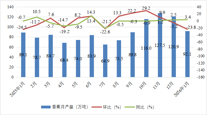 根据中国农垦(热作)网市场监测数据整理,2026年1月全国香蕉主产区总产量为92.1万吨,环比下跌23.8%;与上年同期相比,上涨了3.4%。2025年1月~2026年1月总产量为1163.5万吨,该产量不包括台湾、贵州、四川和重庆的香蕉产量。(具体如表1所示)
