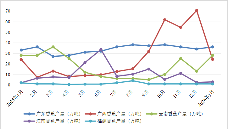 月份 | 广东香蕉产量(万吨) | 广西香蕉产量(万吨) | 云南香蕉产量(万吨) | 海南香蕉产量(万吨) | 福建香蕉产量(万吨) |