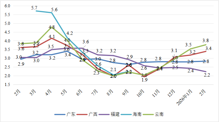 月份 | 广东 | 环比±% | 广西 | 环比±% | 云南 | 环比±% | 福建 | 环比±% | 海南 | 环比±% |
