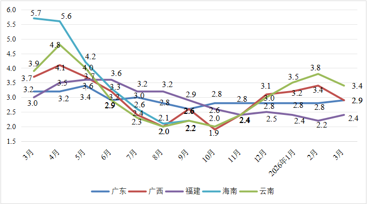 月份 | 广东 | 环比±% | 广西 | 环比±% | 云南 | 环比±% | 福建 | 环比±% | 海南 | 环比±% |