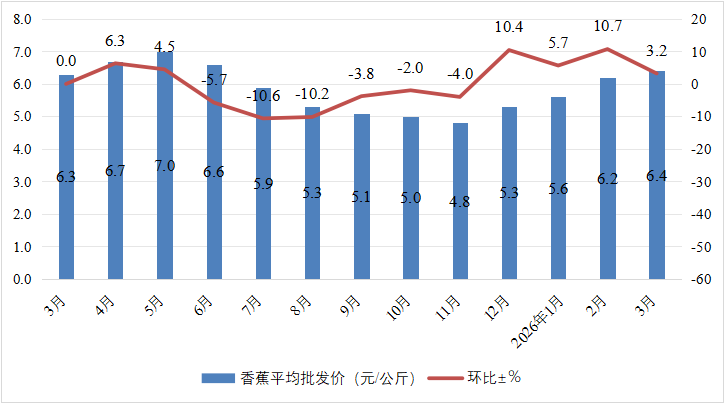 根据农业农村部市场与信息化司、农业农村部信息中心提供的数据,2026年3月,全国香蕉平均批发价为6.4元/公斤,与上月相比上涨了3.2%,与上年同期相比上涨了1.6%;平均零售价为9.1元/公斤,与上月相比上涨了2.2%,与上年同期相比上涨了2.2%。(具体如表3所示)